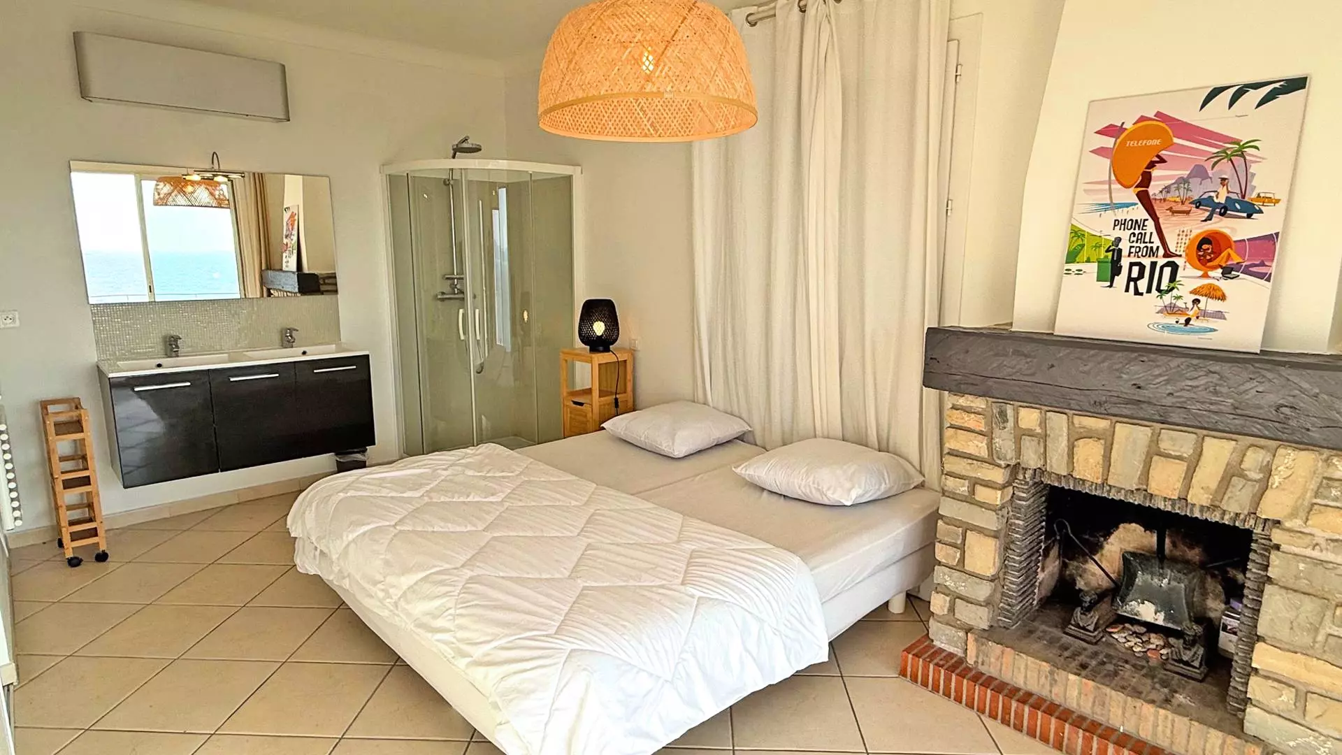 - Bedroom 1 en suite - Sea view with access to terrace and pool - Air conditioning - Two single beds (80cm each) or one double bed (160cm) and wardrobe, with en suite bathroom equipped with double vanity unit and shower