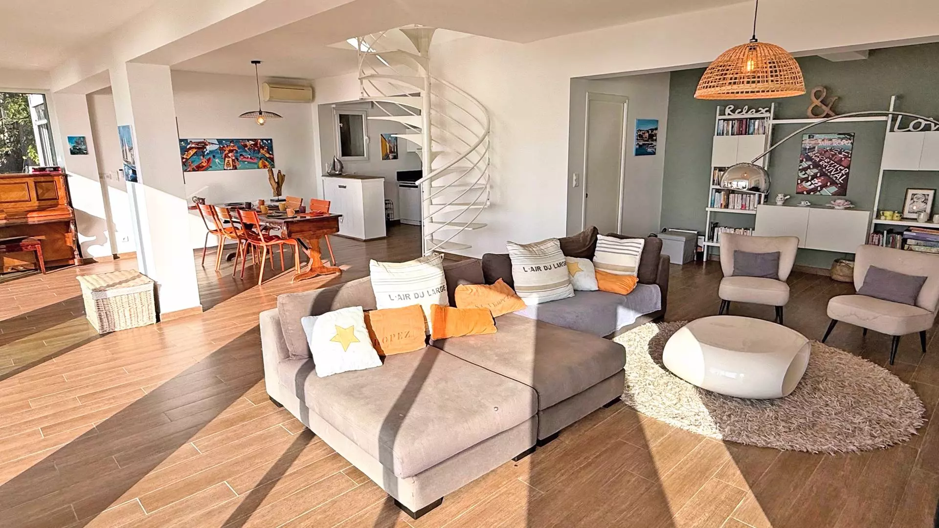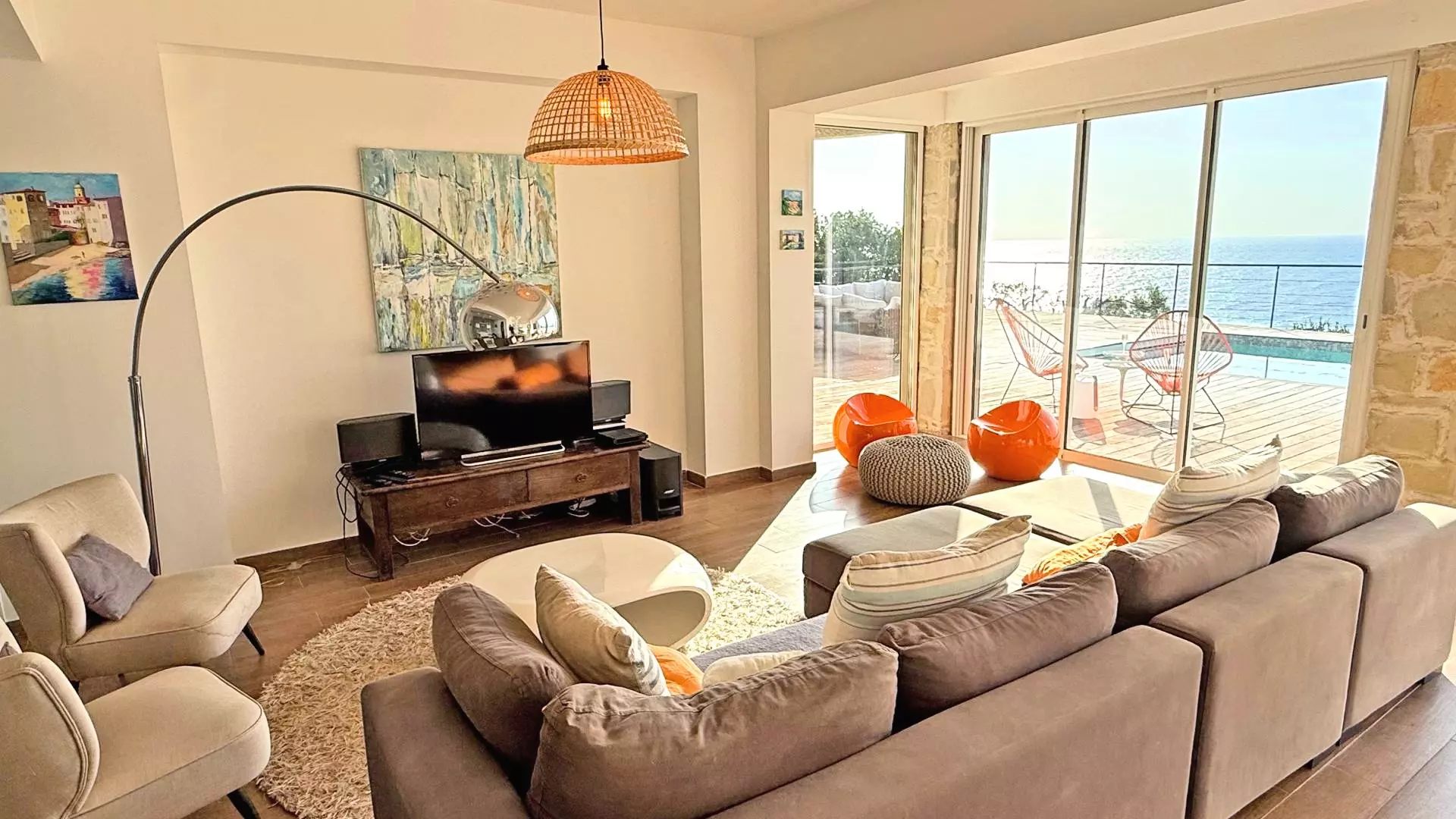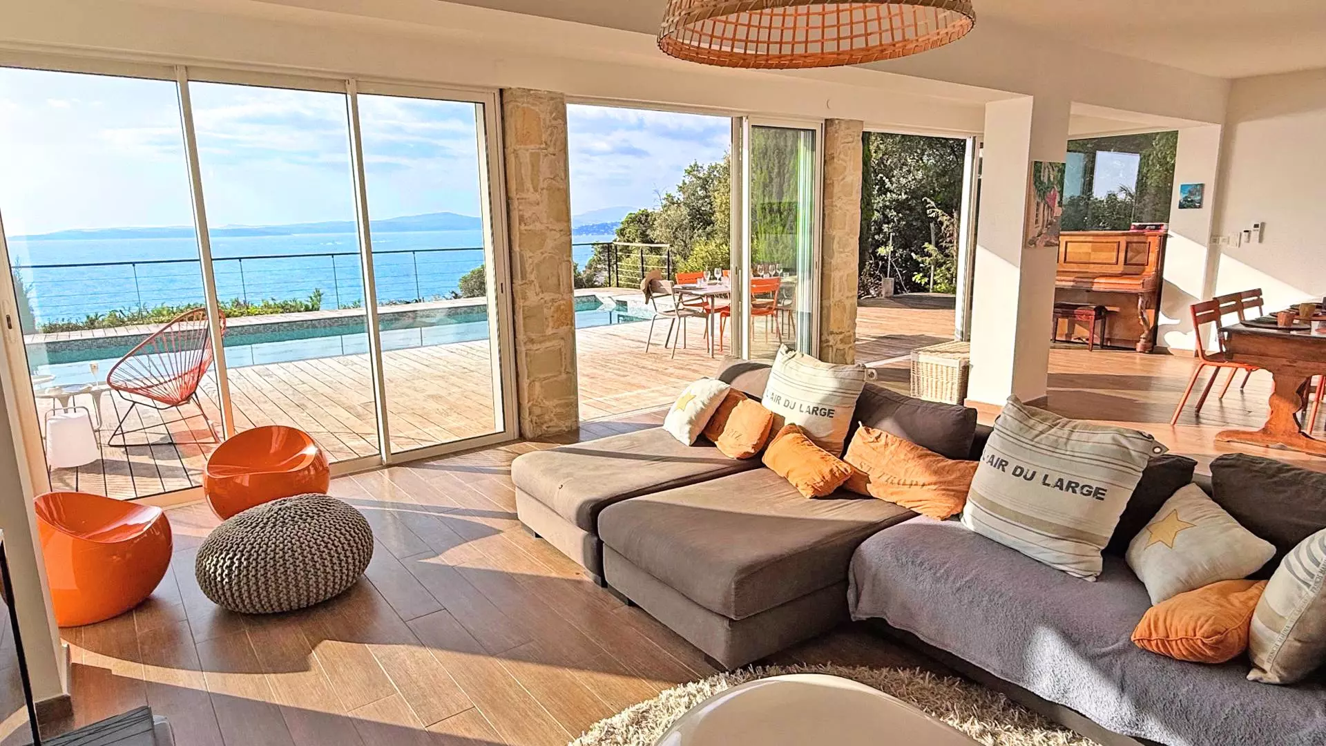 - Living room, air-conditioned, very bright with sea view, lounge equipped with a flat screen television and a large sofa, dining room with access to the pool and covered terrace.