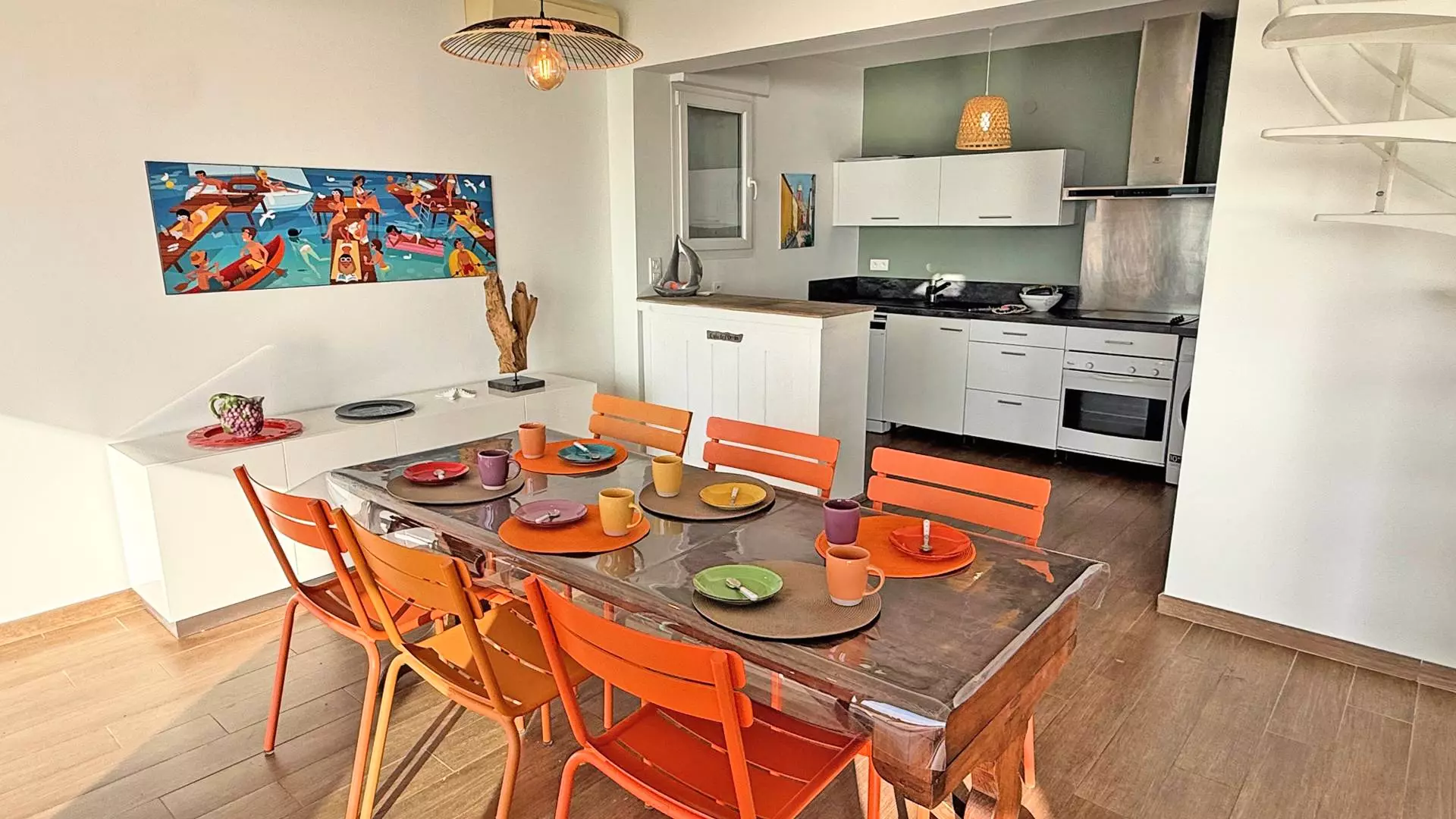- Open-plan fitted kitchen with dishwasher and washing machine, oven, microwave, 4-burner induction hob, American-style refrigerator, filter coffee maker and espresso machine (beans), toaster, kettle with crockery and various utensils.