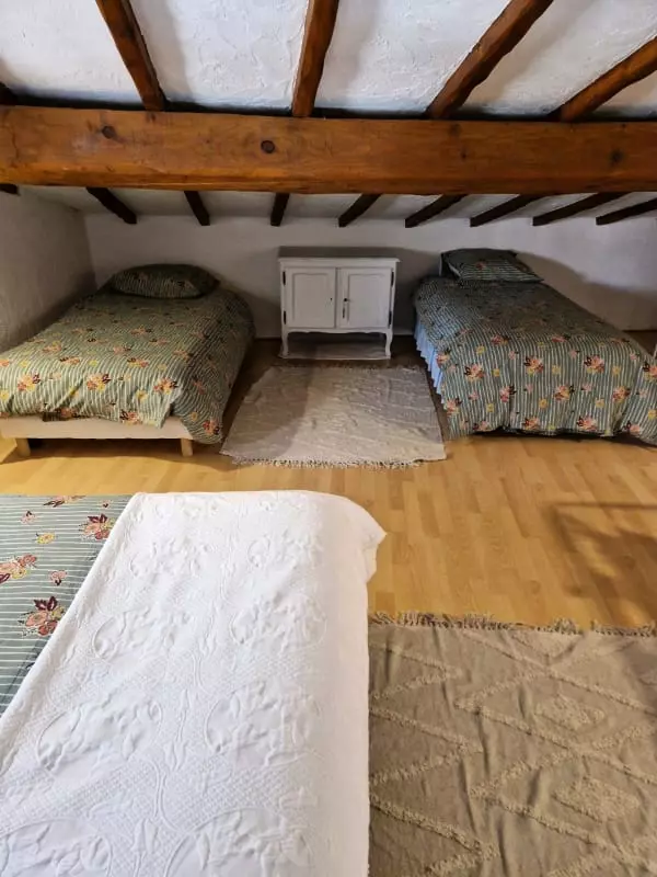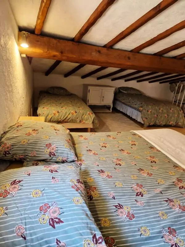- a sleeping area on the mezzanine with a double bed and two single beds;
