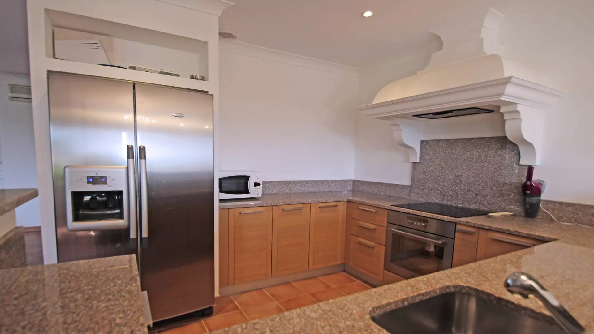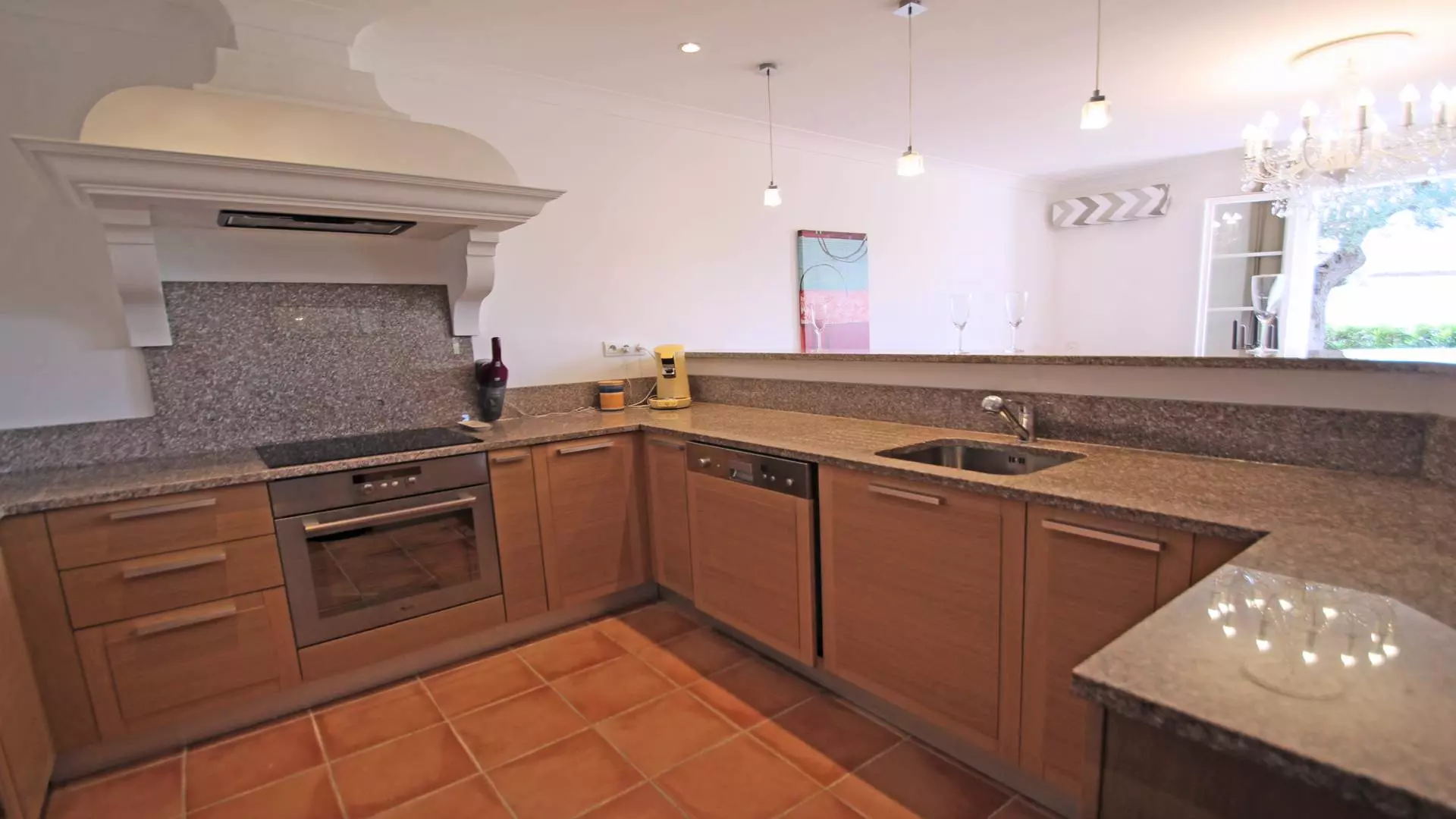 - Fully equipped American kitchen with sink, 4-burner ceramic hob, oven, microwave, coffee machine, Nespresso machine, American fridge, dishwasher, various dishes, etc.
