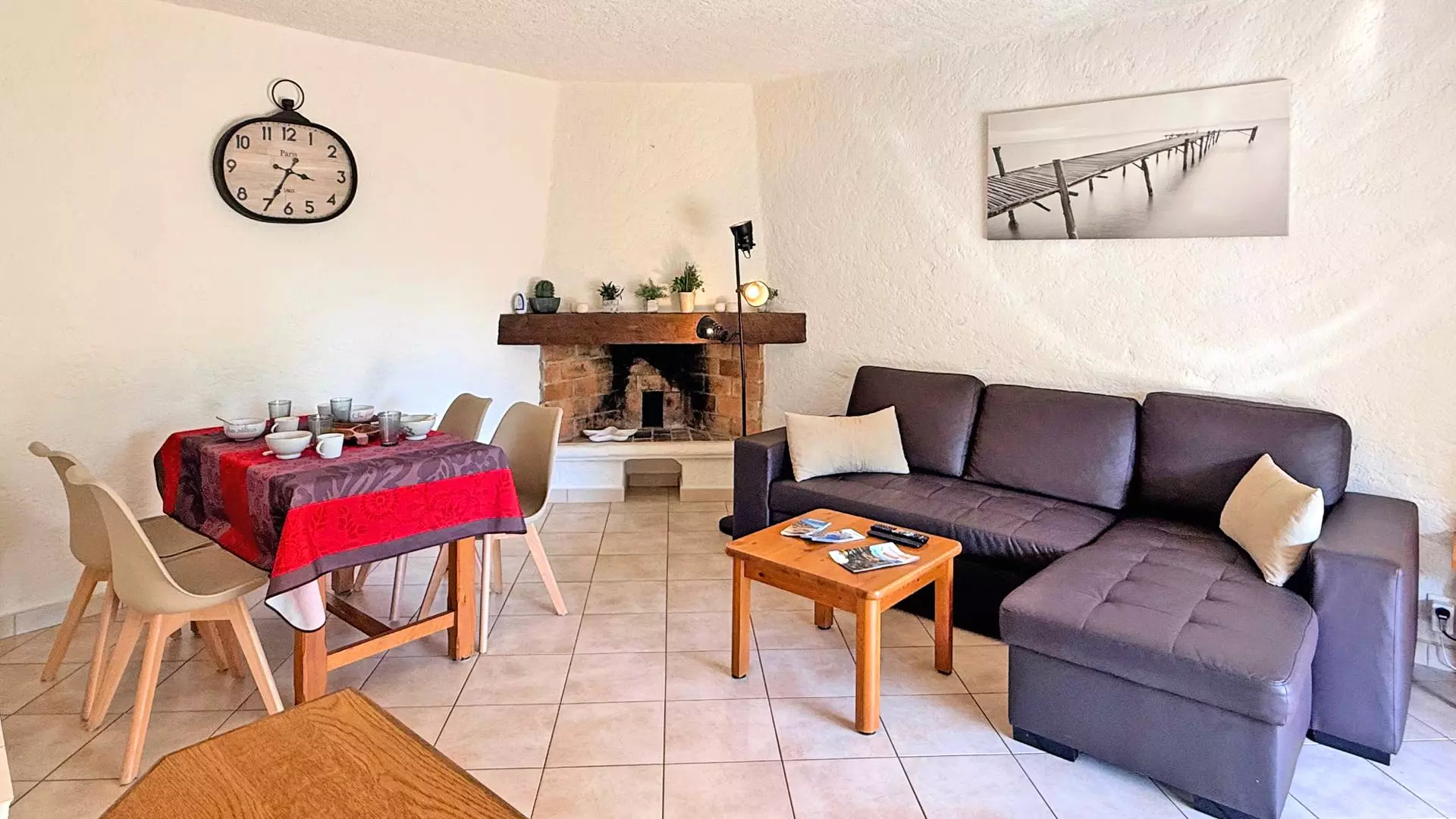 - Living room: lounge area with corner sofa, television, dining area and fireplace