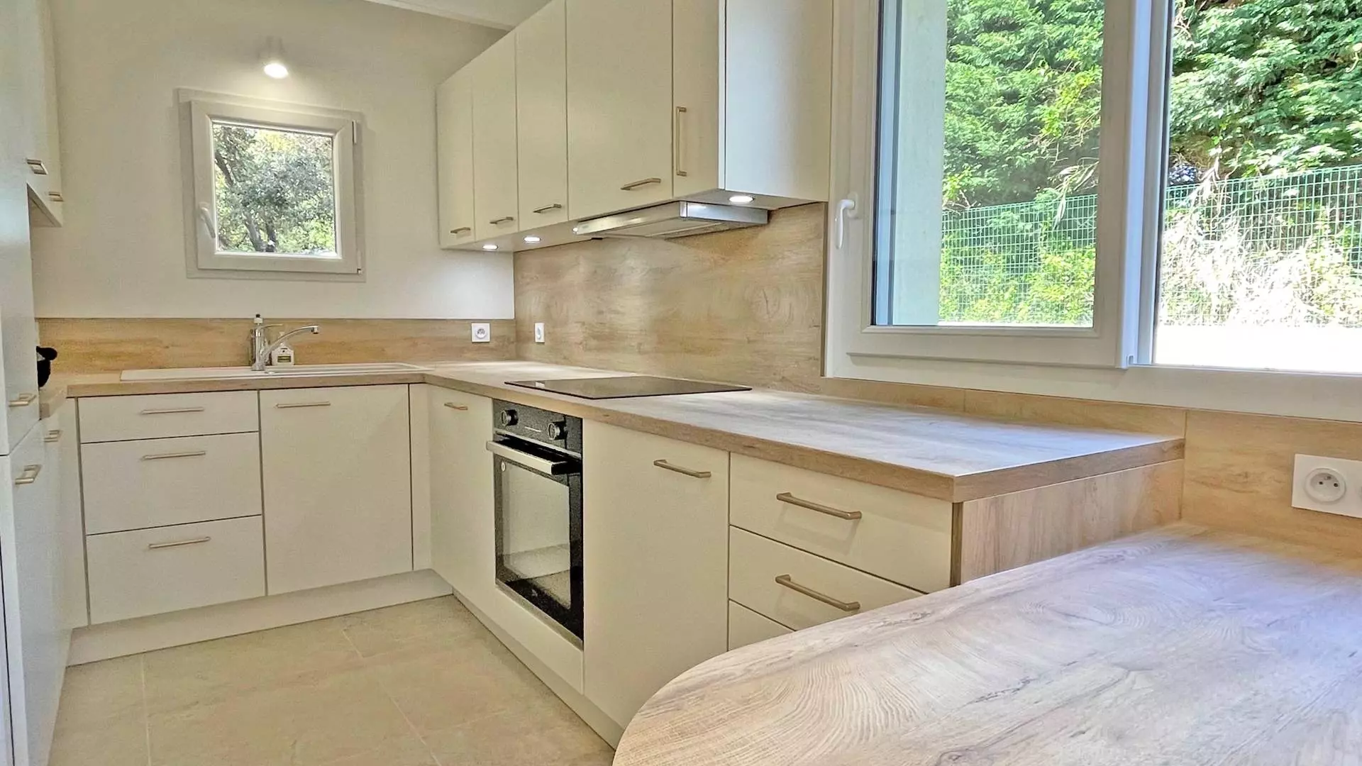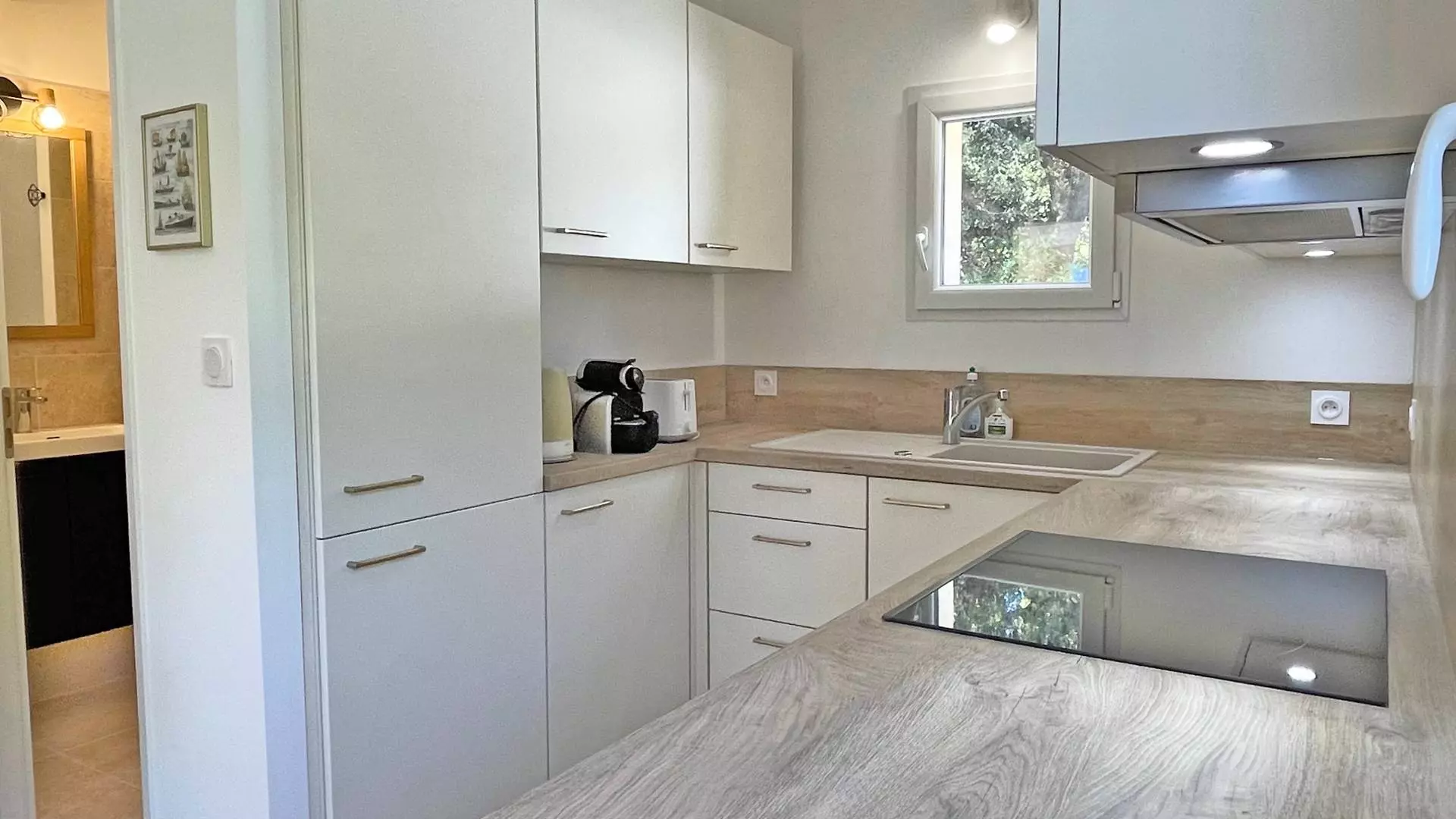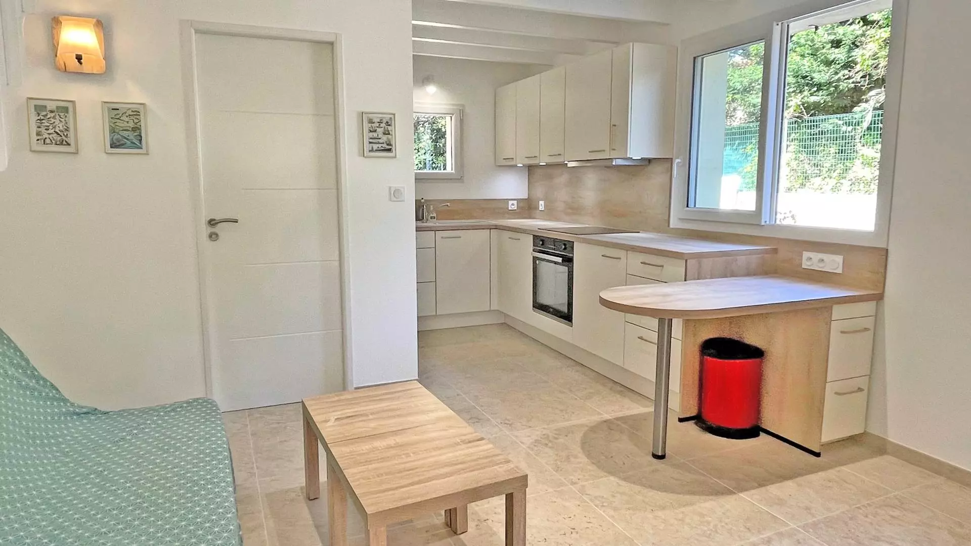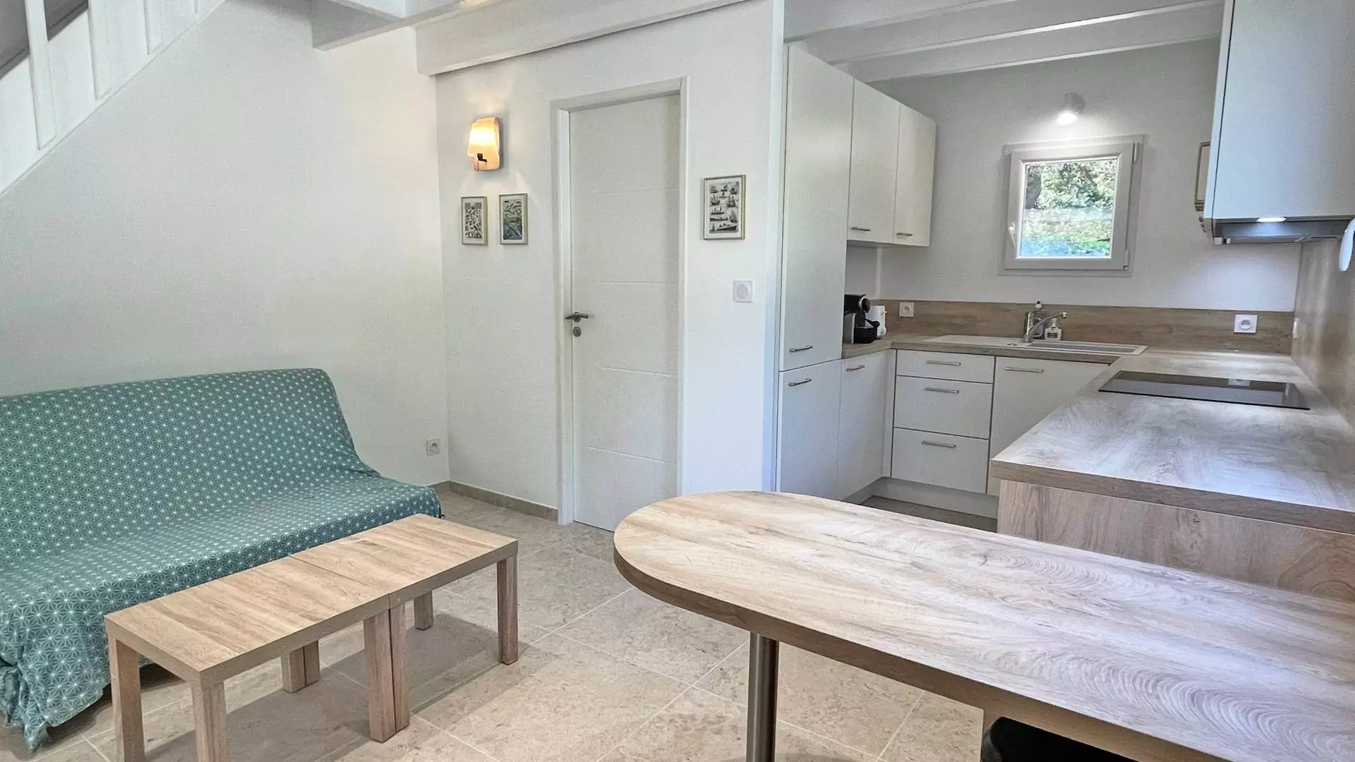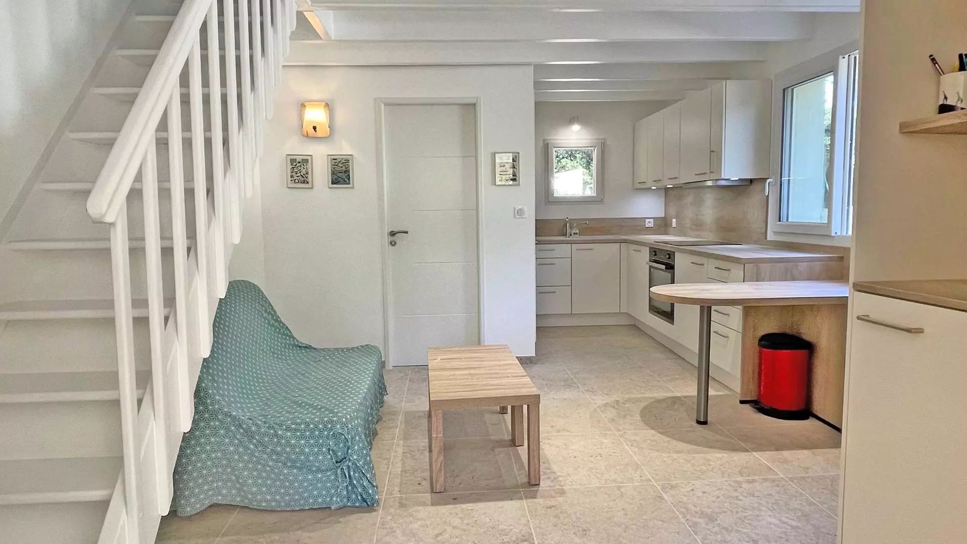 - Living room with BZ sofa bed (140 cm), and open-plan fitted kitchen: hob, oven, dishwasher, washing machine, fridge, freezer, Nespresso coffee machine