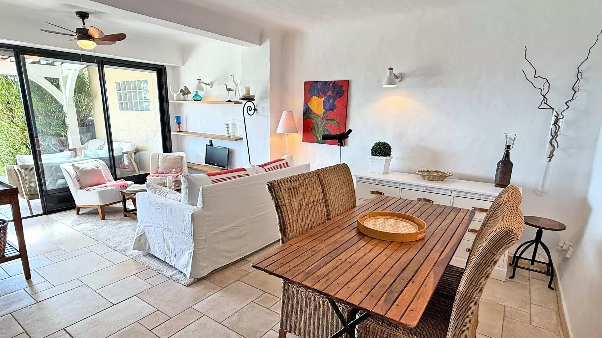 - Living room with sofa and 2 armchairs, flat screen TV and dining room, exterior access