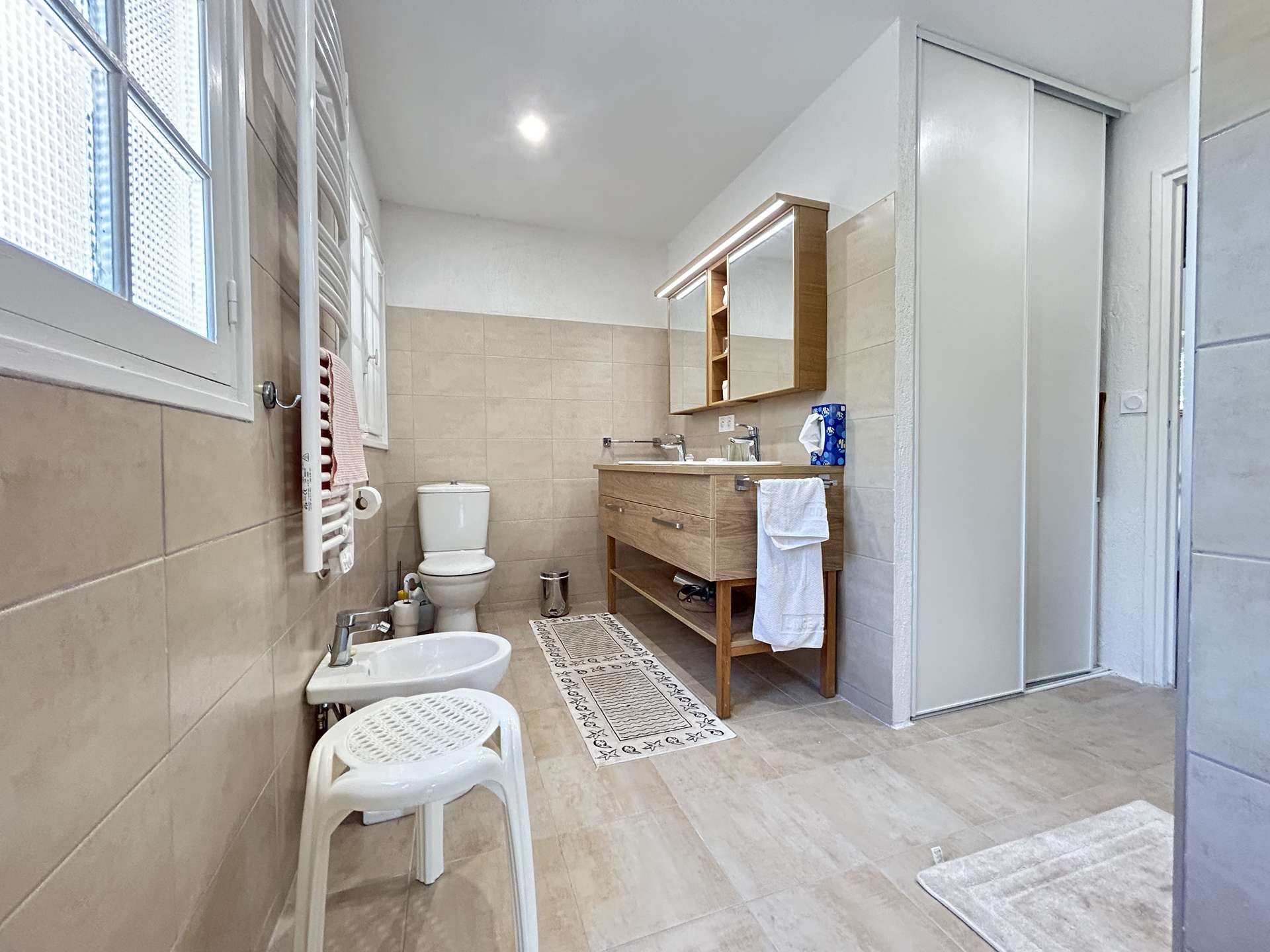 Single-storey villa with Mediterranean charm, full of character and authenticity. Nestled in lush greenery, it is located just a 10-minute walk from La Nartelle beach thanks to direct access to a pedestrian path, reached via a metal gate at the bottom of the garden.