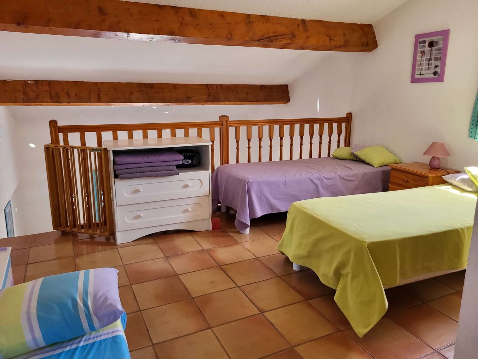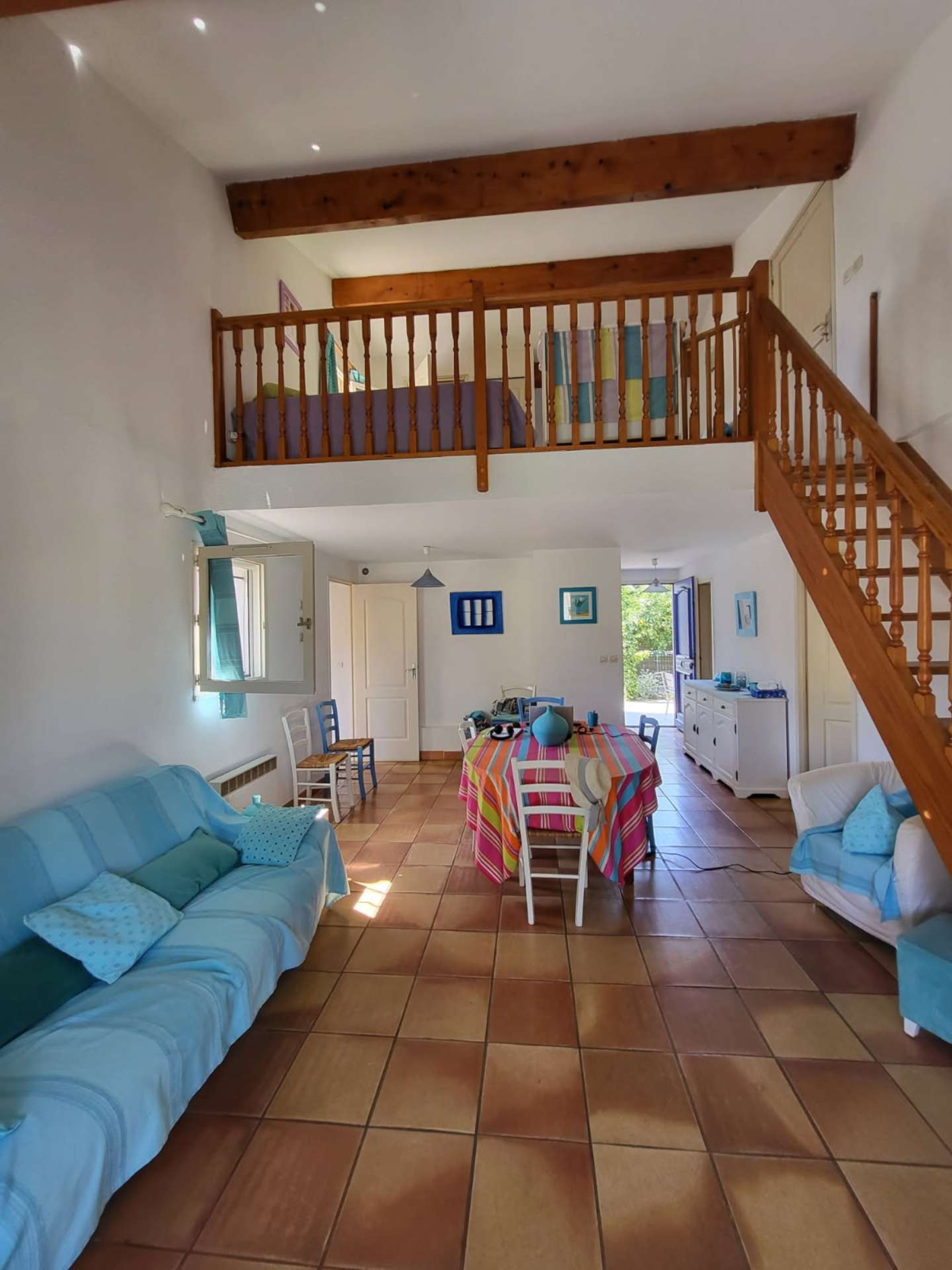 Furnished in a Provençal style and opening onto the outside, it comprises an entrance hall, a beautiful, bright living room with a separate, fully equipped kitchen, and on the ground floor, two bedrooms: one with a 140cm double bed and one with two single beds, a walk-in shower, and a separate toilet. There is also a sleeping area with a sofa bed.
